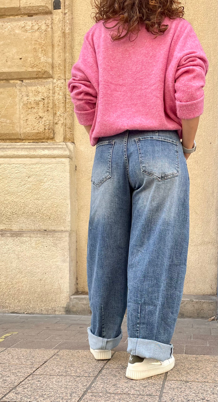Le Jeans Barrel Xl pousse les courbes et les proportions à leur maximum. Taille haute, coupe arrondie extra-ample et jambe large jusqu’à la cheville : il combine confort absolu et présence visuelle forte. Plus audacieux qu’un barrel classique, il s’inspire de l’exagération iconique des années 2000 pour un look à la fois Street et ultra mode.