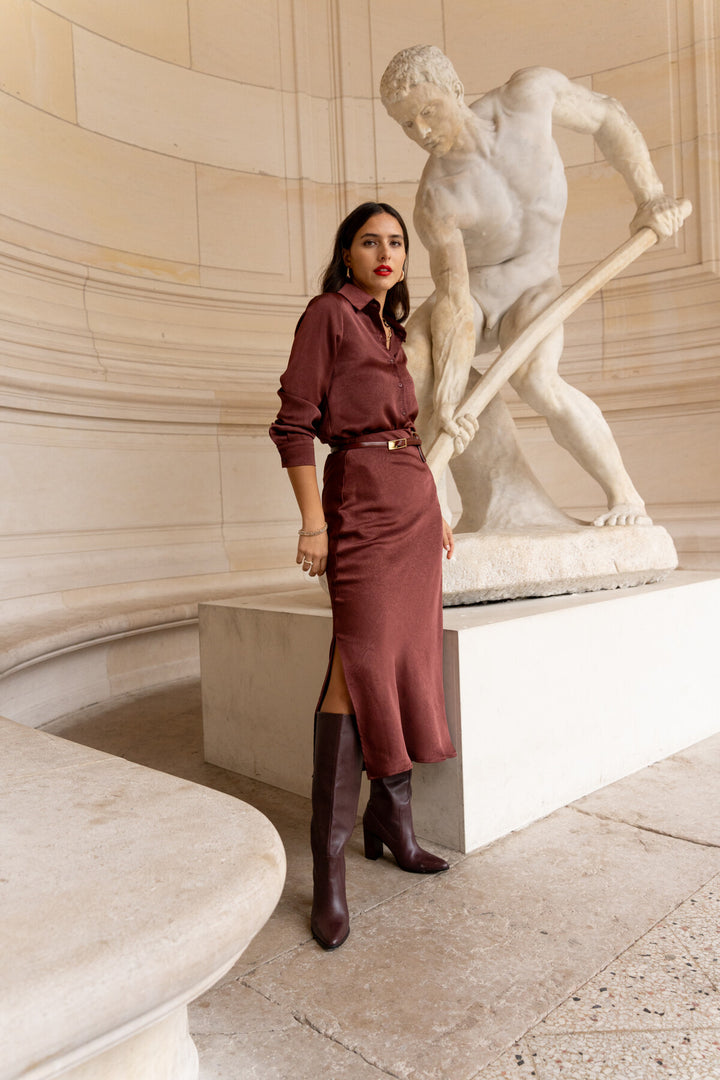 Jupe fluide Babette longue pour une silhouette affinée et colorée. Sa coupe épousant les formes féminines pour une tenue pleine d'assurance et d'élégance. Babette aborde la couleur Bordeaux pour se fondre à l'idéale des tons automnales.