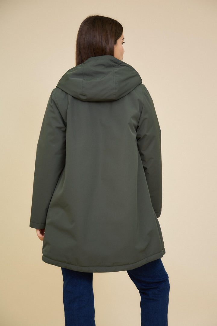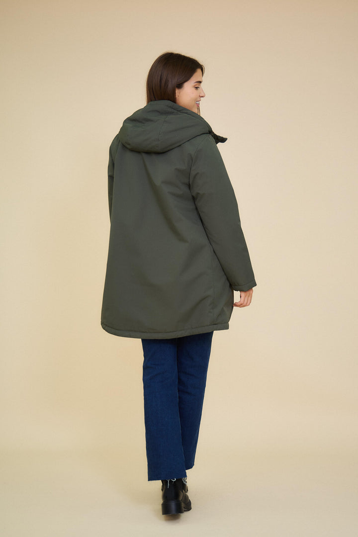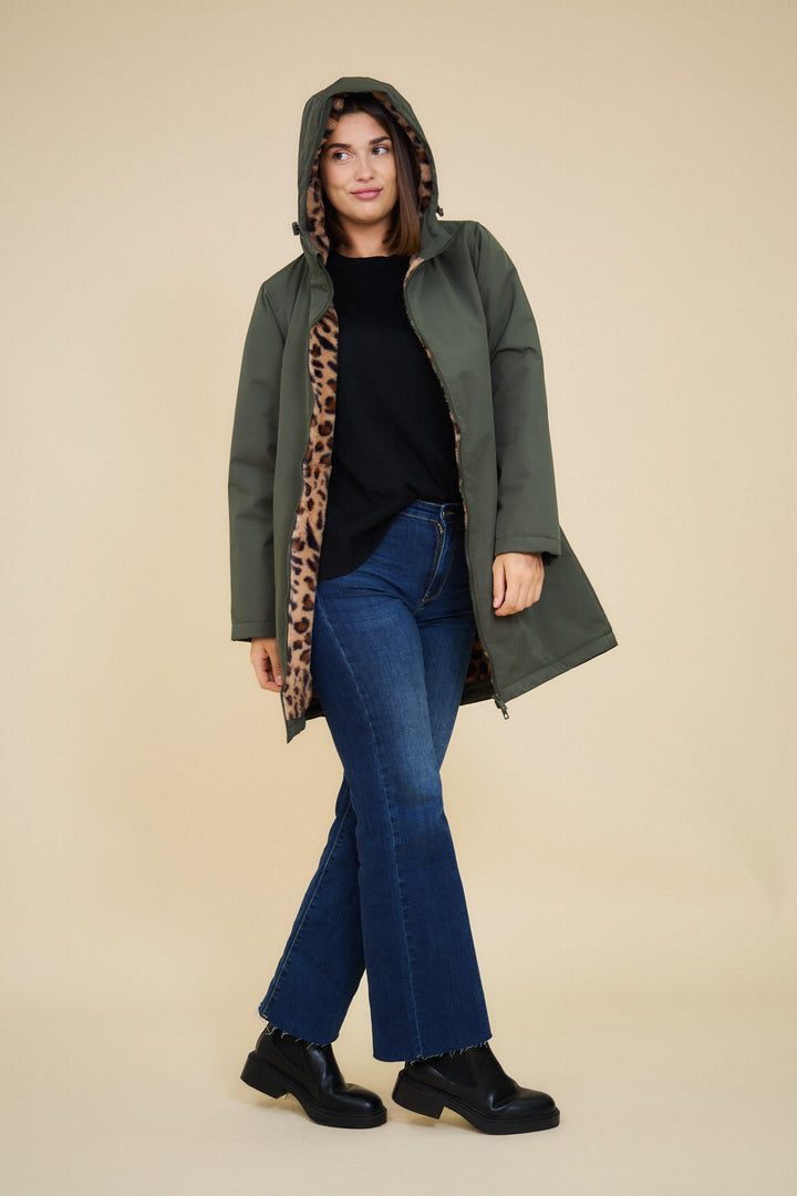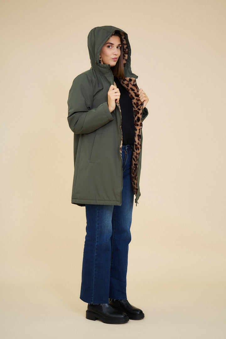 Parka courte imperméable et intérieur fourré léopard à capuche de couleur kaki